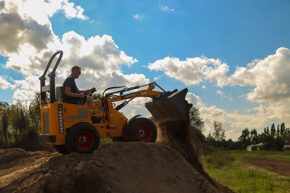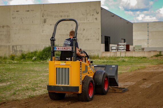 The Knikmops KM130 weighs 1350 kg itself and is able to lift some 1260 kg. This compact articulated loader is around 1.25 m wide so it is easy to use in narrow spaces such as a park, garden or in demolition works. With its robust steel chassis, this small wheel loader is suited for demanding jobs.The hydraulic function of the Knikmops makes it perfectly suited to carry out a variety of jobs in addition to earthworks, for example mowing, mixing stabilised sand, or drilling holes.